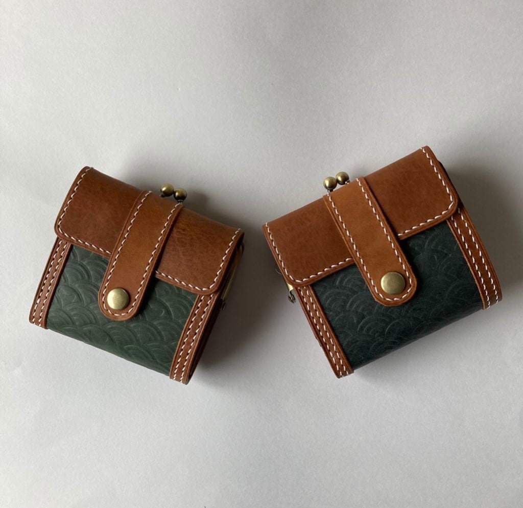 【懐(かい)-がま口二つ折り財布-】 大正レトロの意匠を意識し、どこか懐かしさを感じる佇まいに仕立てた財布、シリーズ化にあたり「懐」(かい)と名付けました。 がま口ならではの形を活かし、必要なものを懐に収める感覚を大切にしています。 【藤陰(とういん)シリーズ】 茶×緑で革の色味を統一。 内装は藤棚の下にいる黒猫をメインにしたシリーズ。 柄の出し方で表情が変わるので、シリーズなのに一点もの感も味わえます。 +++ 外装には青海波が刻印されており、その中には可愛らしい猫が隠れています刻印をひとつづつ押しているため非常に手間のかかる工程を経ています。 カードは6枚入り。コインケースは仕切りがあるので使い勝手に合わせてお使いください。 植物由来のタンニンでなめした国産の牛革を使用。経年変化を楽しむことができ、長く愛用していただけます。 素材:国産 牛革 発送:レターパックプラス(600円・日本郵便) サイズ:110×110×358(mm)※蓋を閉めた時