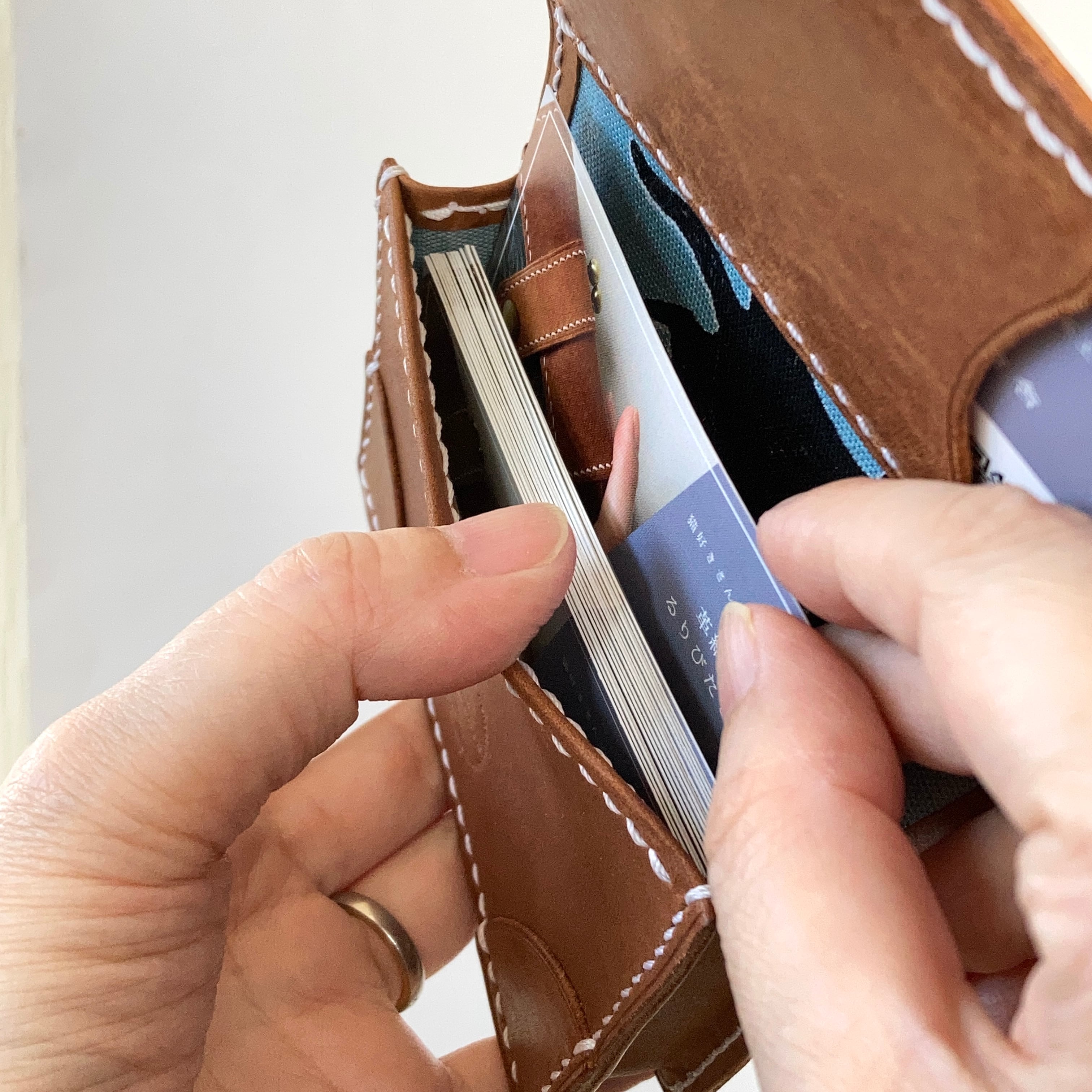 頂戴した名刺をサッと差し込める専用ポケットが付いており、カード入れ2段とフリーポケットも備えています。