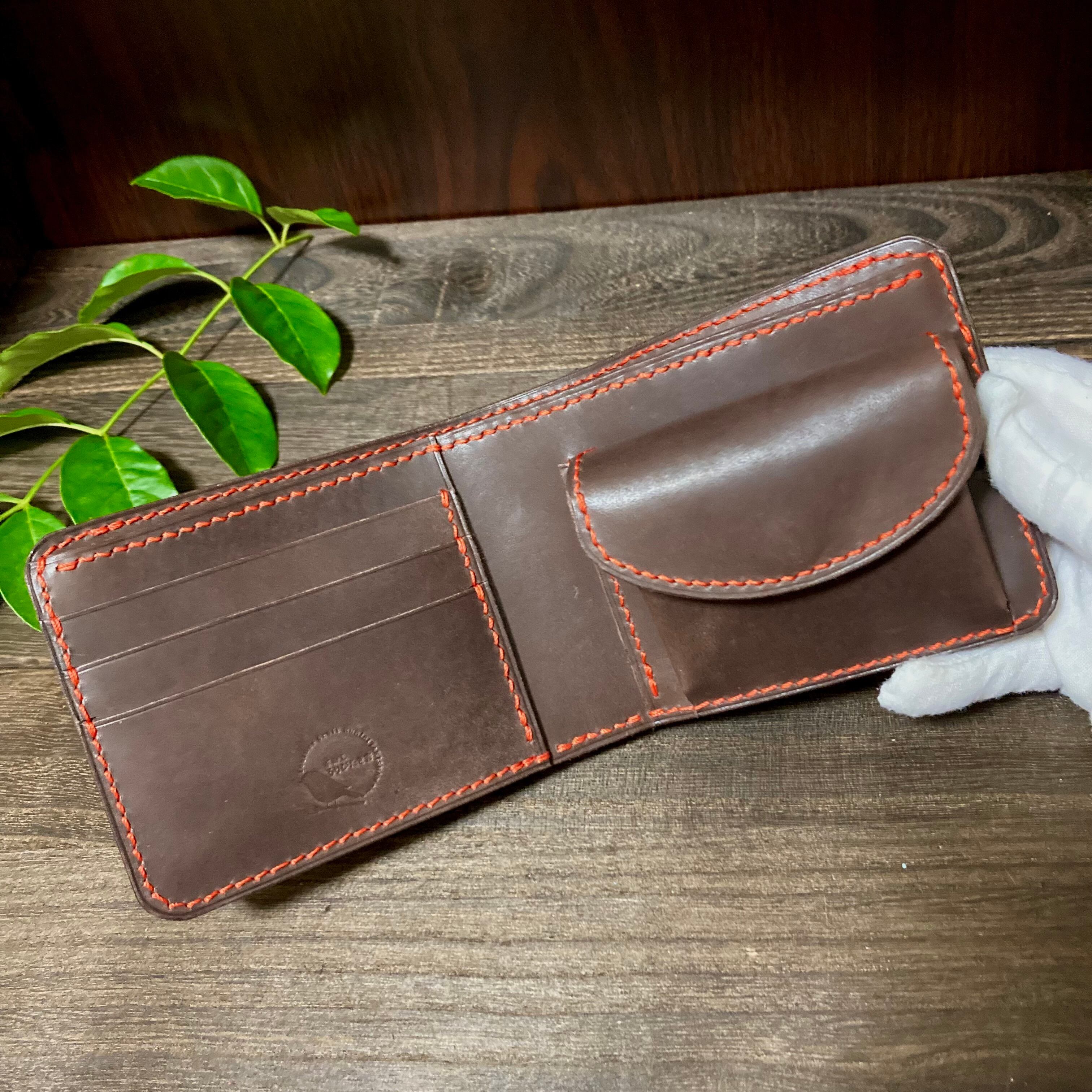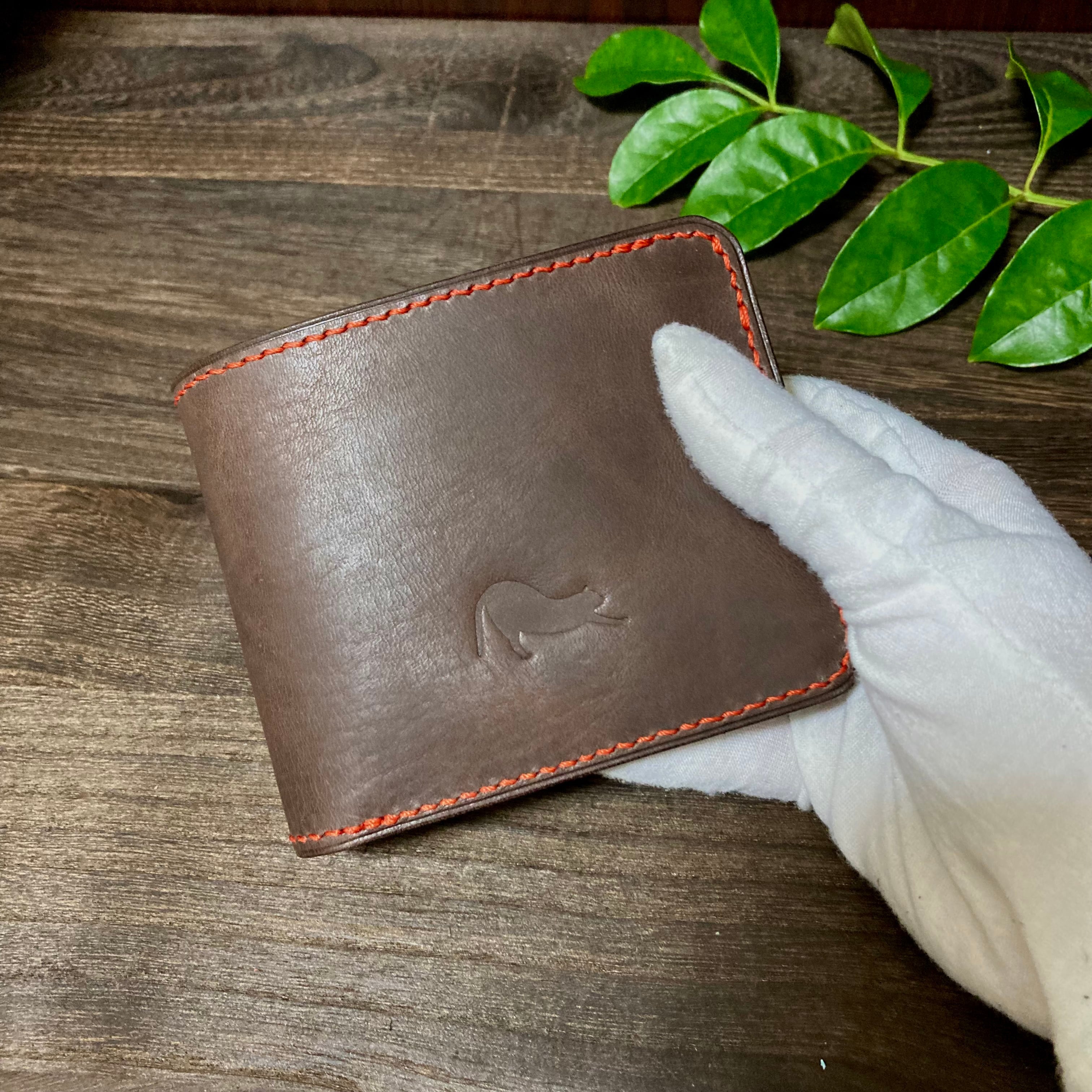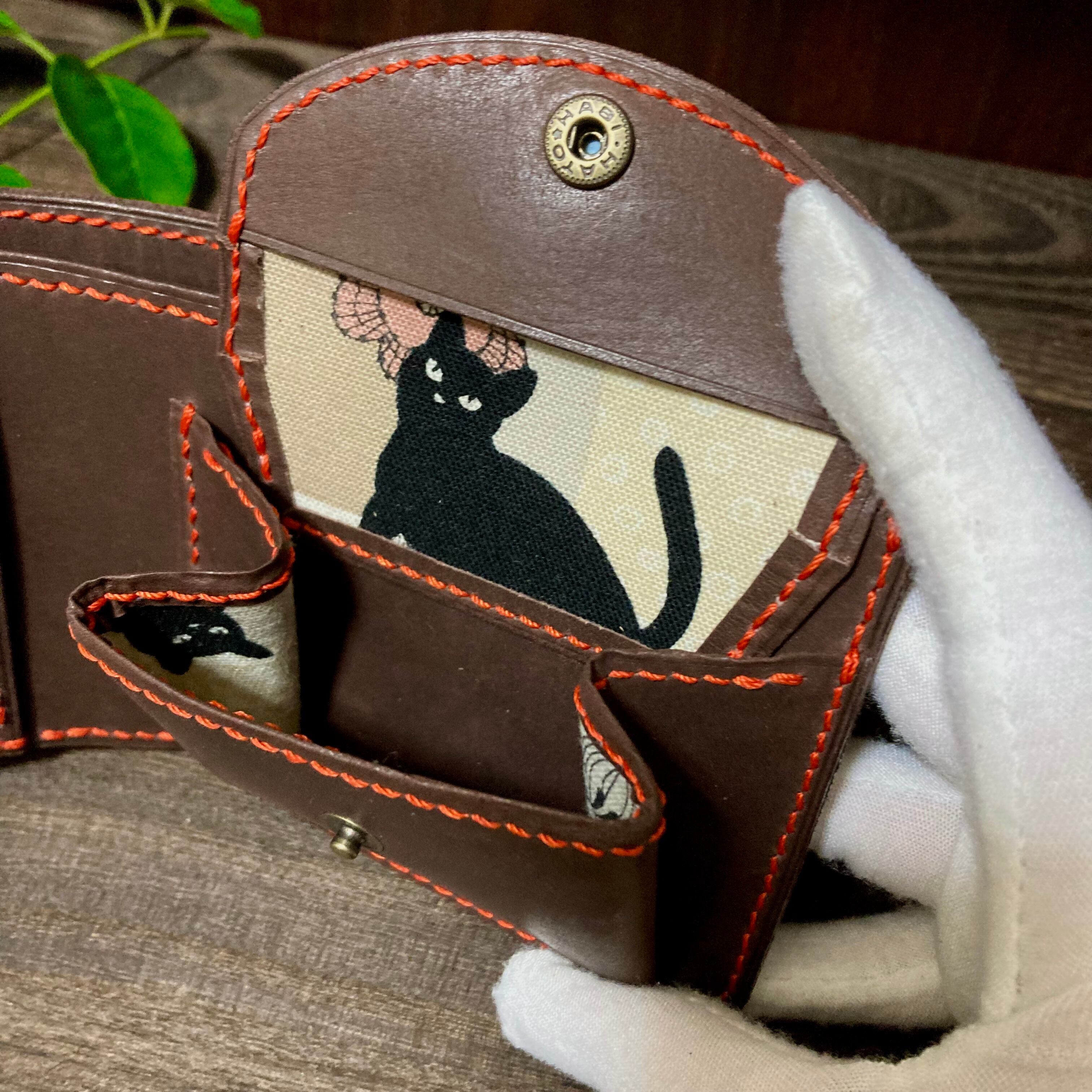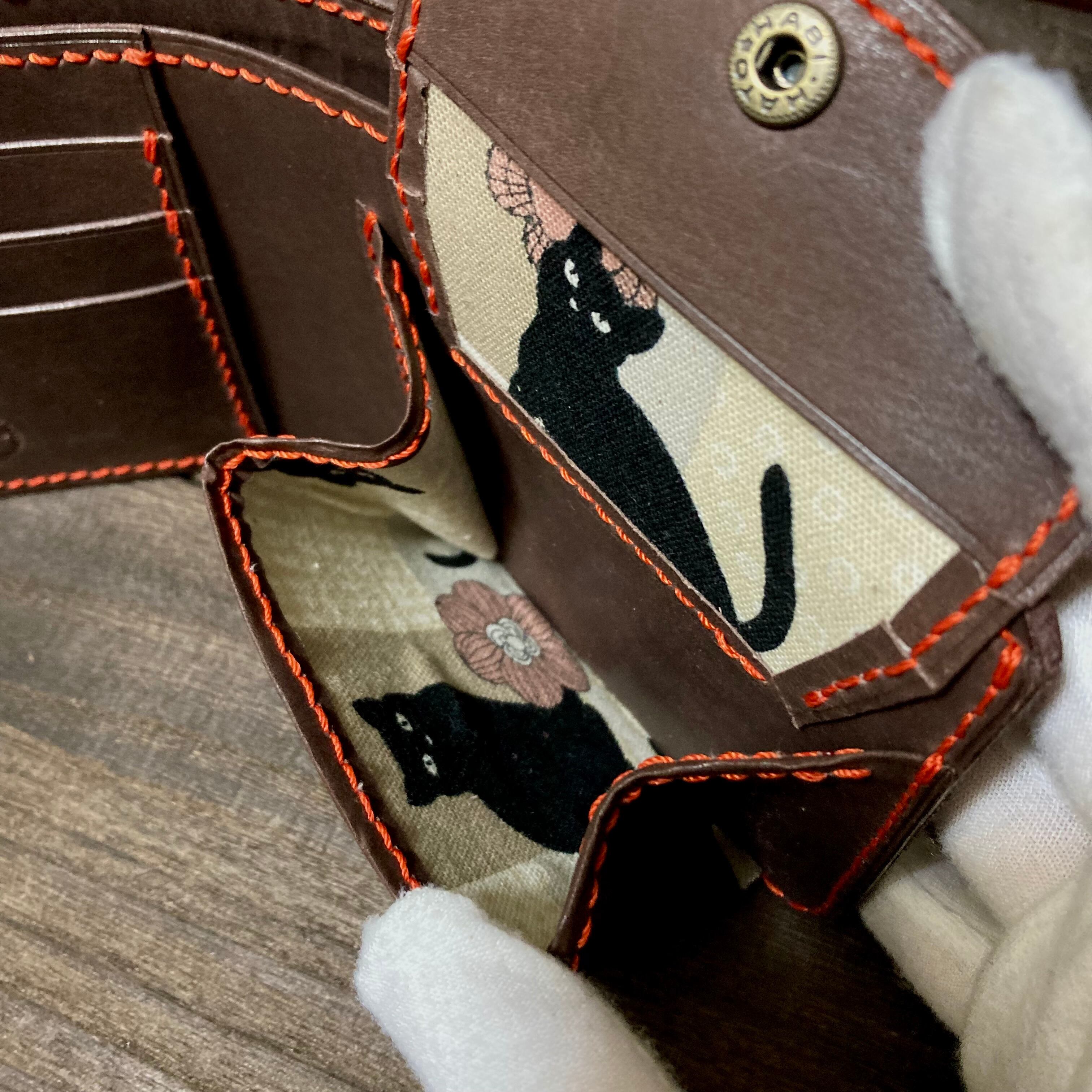 全て手縫いの、猫好きさんのための本革二つ折財布です。